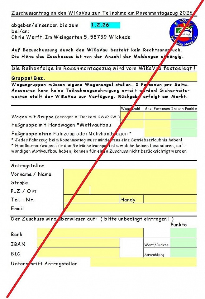 Aber 2027 gibt es beim WiKaVau wieder Zuschüsse für Wagenbauer und Fußgruppen, um den Start beim Rosenmontagsumzug zu fördern ! Hier als Download der alte Antrag - bitte auf das Bild klicken. Alternativ lässt sich das Dokument hier - Zuschussantrag ALT 2026 - herunterladen, dazu auf den Text klicken!